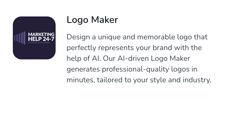 Logo Maker: Design a unique and memorable logo that perfectly represents your brand with the help of AI. Our AI-driven Logo Maker generates professional-quality logos in minutes, tailored to your style and industry.