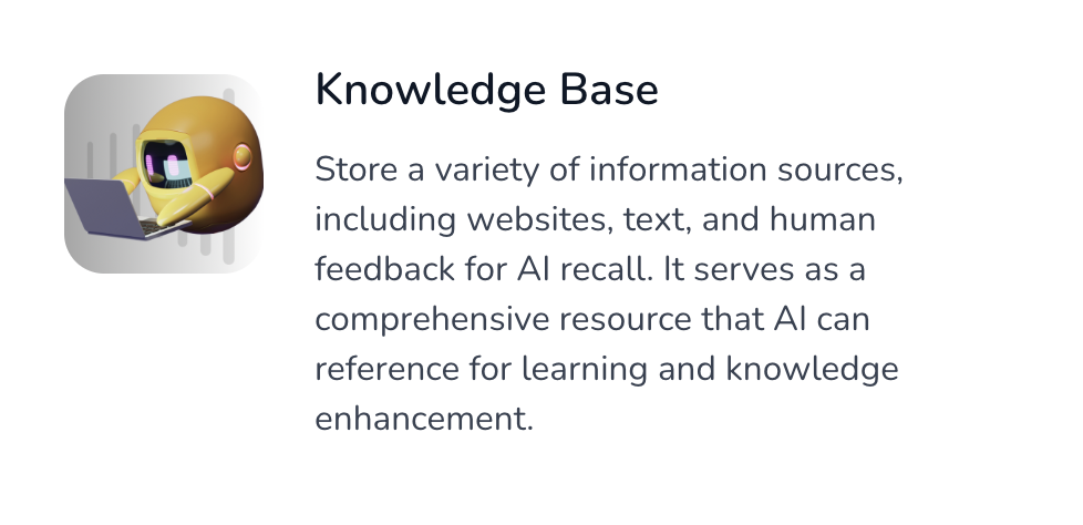 Knowledge Base: Store a variety of information sources, including websites, text, and human feedback for AI recall. It serves as a comprehensive resource that AI can reference for learning and knowledge enhancement.