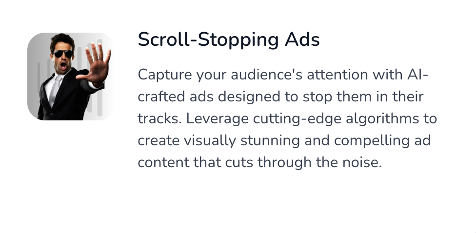 Scroll-Stopping Ads: Capture your audience's attention with AI-crafted ads designed to stop them in their tracks. Leverage cutting-edge algorithms to create visually stunning and compelling ad content that cuts through the noise.