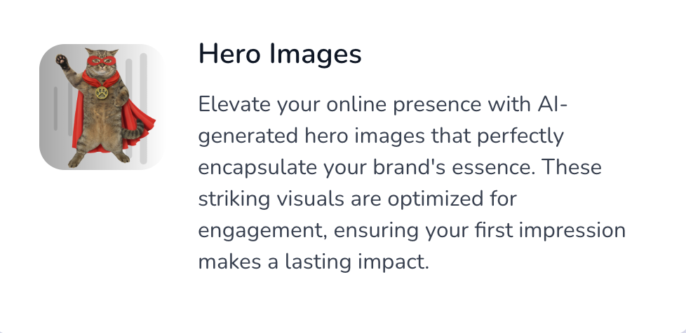 Hero Images: Elevate your online presence with AI-generated hero images that perfectly encapsulate your brand's essence. These striking visuals are optimized for engagement, ensuring your first impression makes a lasting impact.