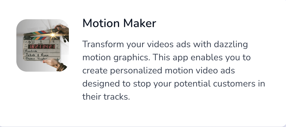 Motion Maker: Transform your videos ads with dazzling motion graphics. This app enables you to create personalized motion video ads designed to stop your potential customers in their tracks.