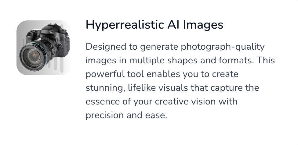 Hyper Realistic AI Images: Designed to generate photograph-quality images in multiple shapes and formats. This powerful tool enables you to create stunning, lifelike visuals that capture the essence of your creative vision with precision and ease.