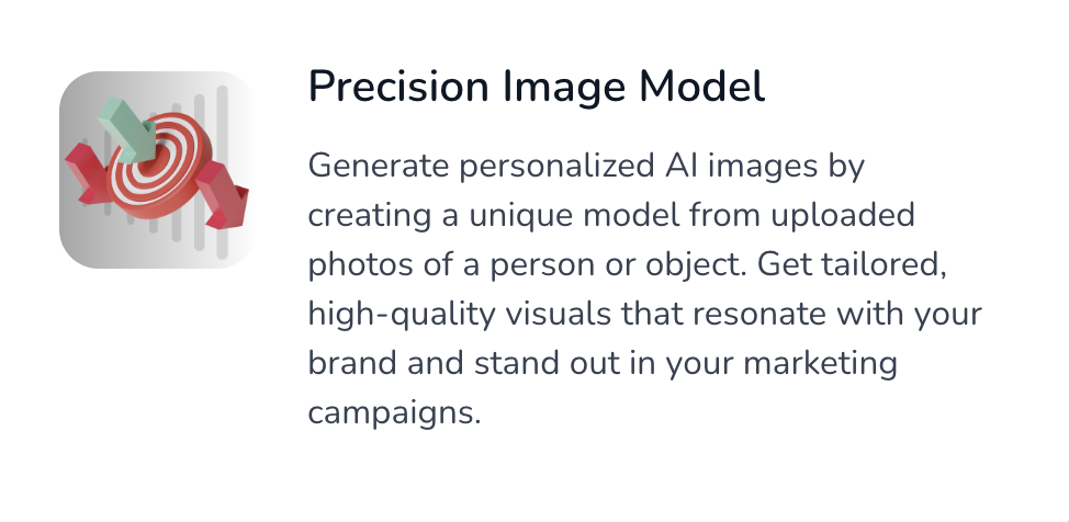 Precision Image Model: Generate personalized AI images by creating a unique model from uploaded photos of a person or object. Get tailored, high-quality visuals that resonate with your brand and stand out in your marketing campaigns.