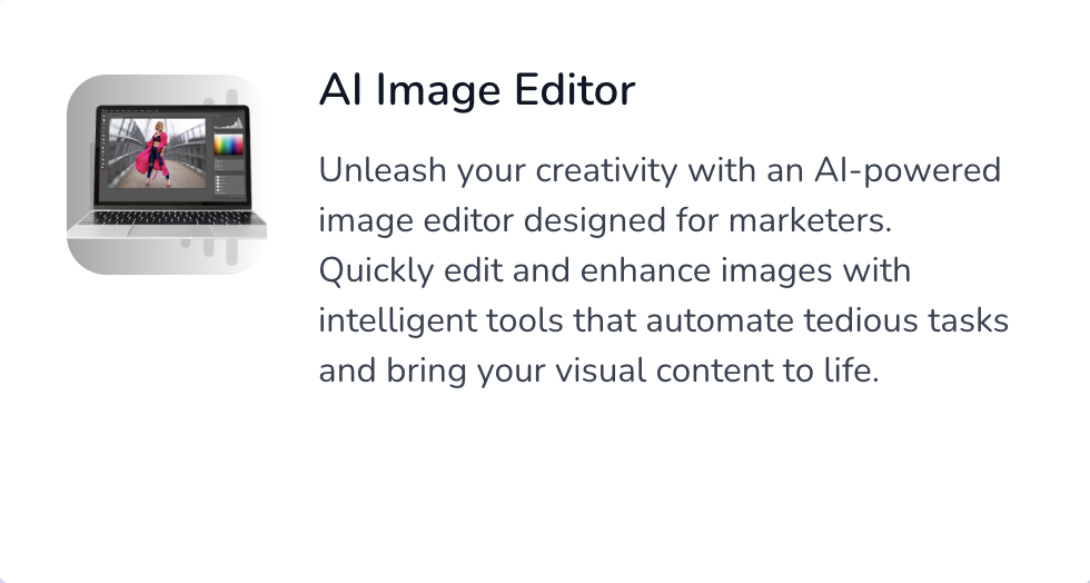 AI Image Editor: Unleash your creativity with an AI-powered image editor designed for marketers. Quickly edit and enhance images with intelligent tools that automate tedious tasks and bring your visual content to life.