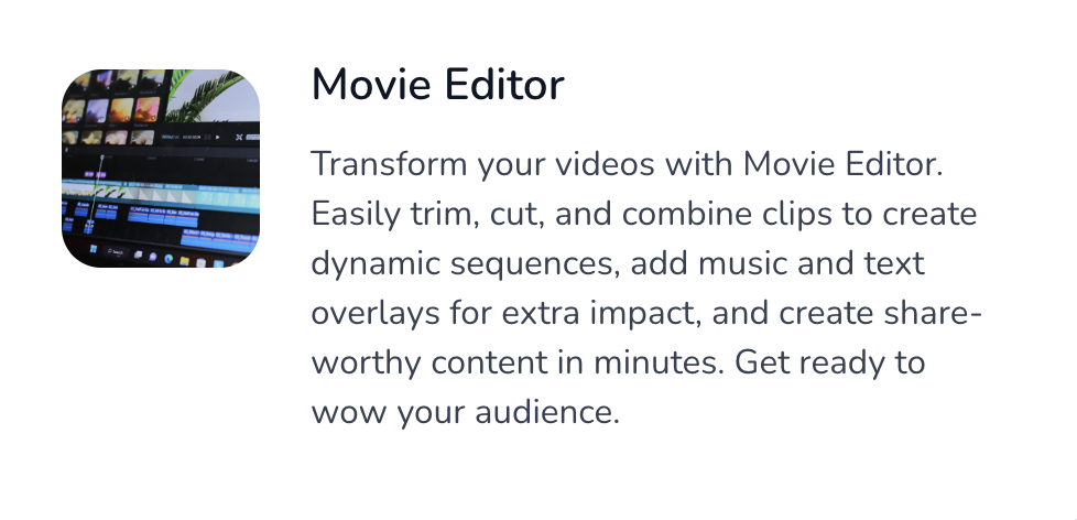 Movie Editor: Transform your videos with Movie Editor. Easily trim, cut, and combine clips to create dynamic sequences, add music and text overlays for extra impact, and create share-worthy content in minutes. Get ready to wow your audience.