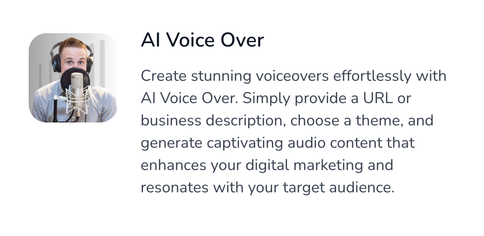 AI Voiceover: Create stunning voiceovers effortlessly with AI Voice Over. Simply provide a URL or business description, choose a theme, and generate captivating audio content that enhances your digital marketing and resonates with your target audience.
