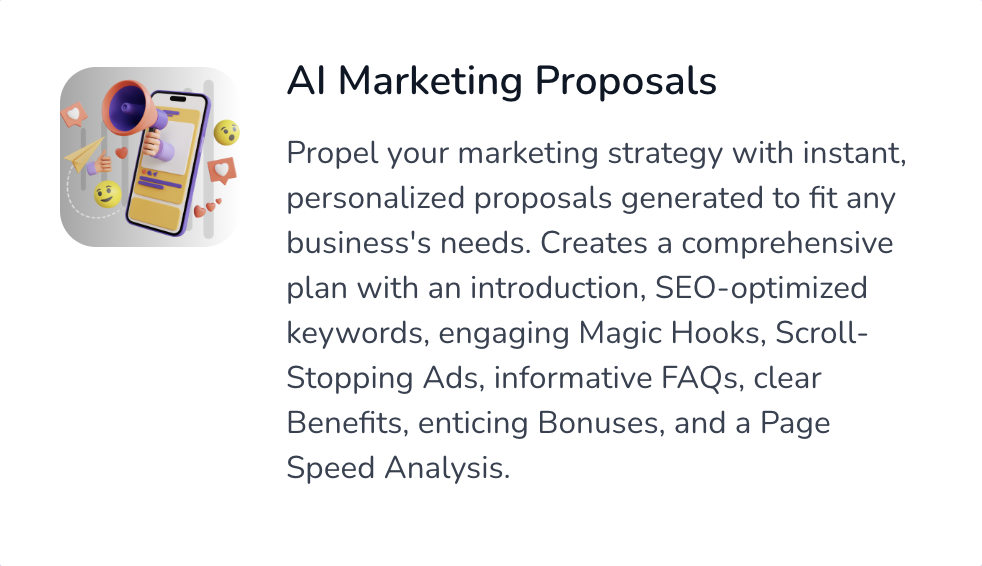 AI Marketing Proposals: Propel your marketing strategy with instant, personalized proposals generated to fit any business's needs. Creates a comprehensive plan with an introduction, SEO-optimized keywords, engaging Magic Hooks, Scroll-Stopping Ads, informative FAQs, clear Benefits, enticing Bonuses, and a Page Speed Analysis.