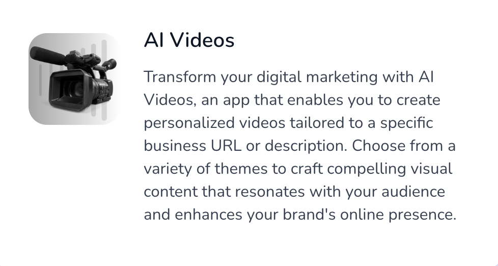 AI Videos: Transform your digital marketing with AI Videos, an app that enables you to create personalized videos tailored to a specific business URL or description. Choose from a variety of themes to craft compelling visual content that resonates with your audience and enhances your brand's online presence.