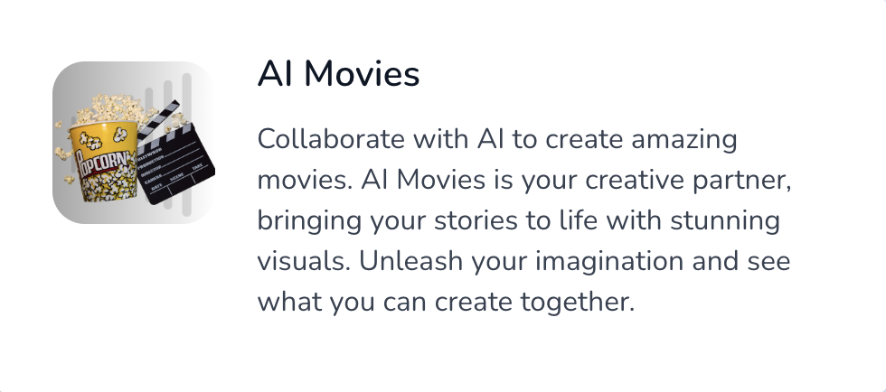 AI Movies: Collaborate with AI to create amazing movies. AI Movies is your creative partner, bringing your stories to life with stunning visuals. Unleash your imagination and see what you can create together.