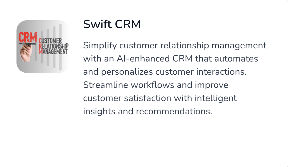 Swift CRM: Simplify customer relationship management with an AI-enhanced CRM that automates and personalizes customer interactions. Streamline workflows and improve customer satisfaction with intelligent insights and recommendations.