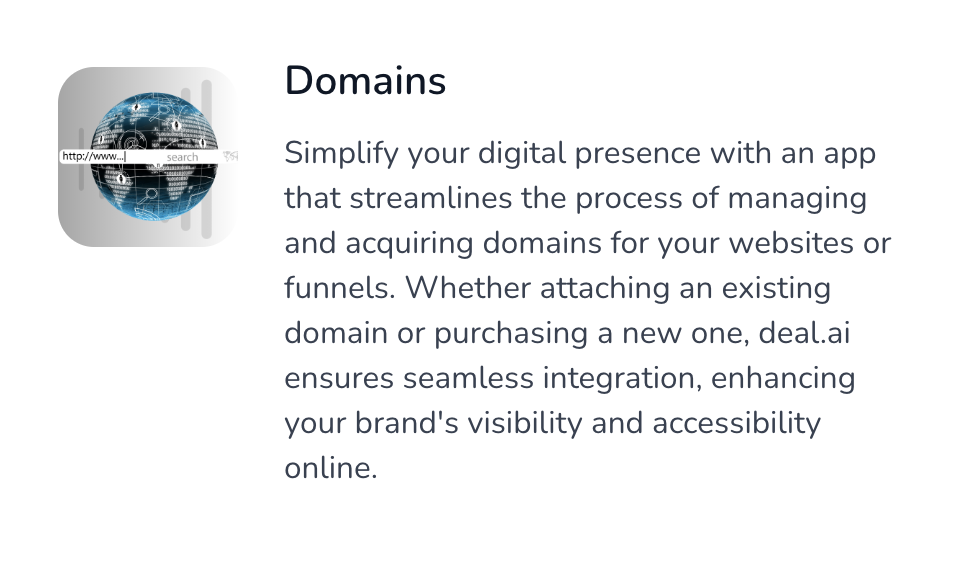 Domains: Simplify your digital presence with an app that streamlines the process of managing and acquiring domains for your websites or funnels. Whether attaching an existing domain or purchasing a new one, deal.ai ensures seamless integration, enhancing your brand's visibility and accessibility online.