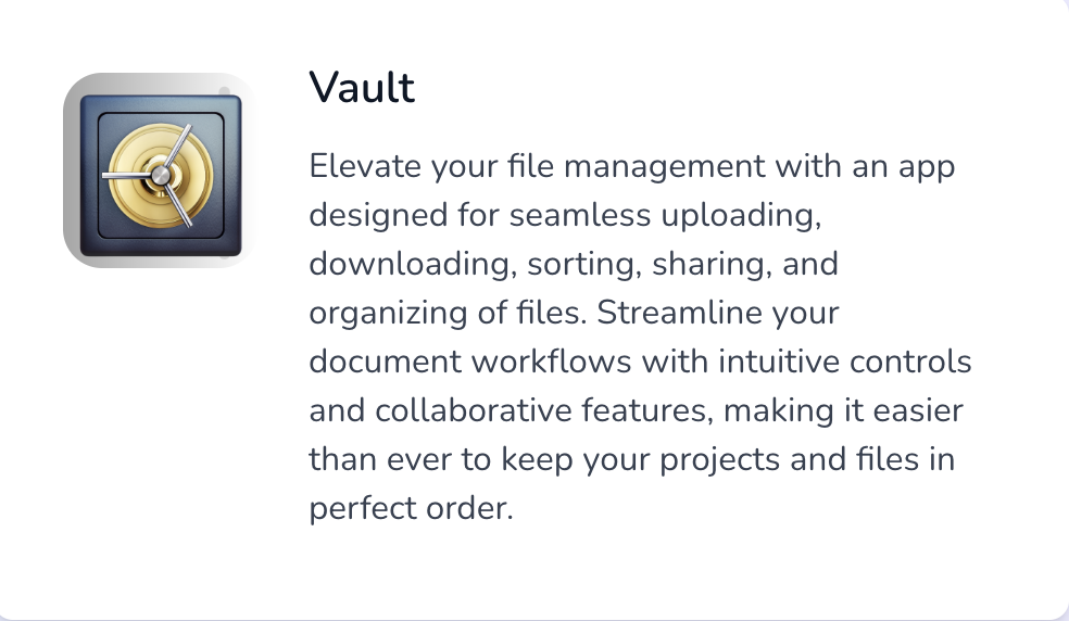 Vault: Elevate your file management with an app designed for seamless uploading, downloading, sorting, sharing, and organizing of files. Streamline your document workflows with intuitive controls and collaborative features, making it easier than ever to keep your projects and files in perfect order.