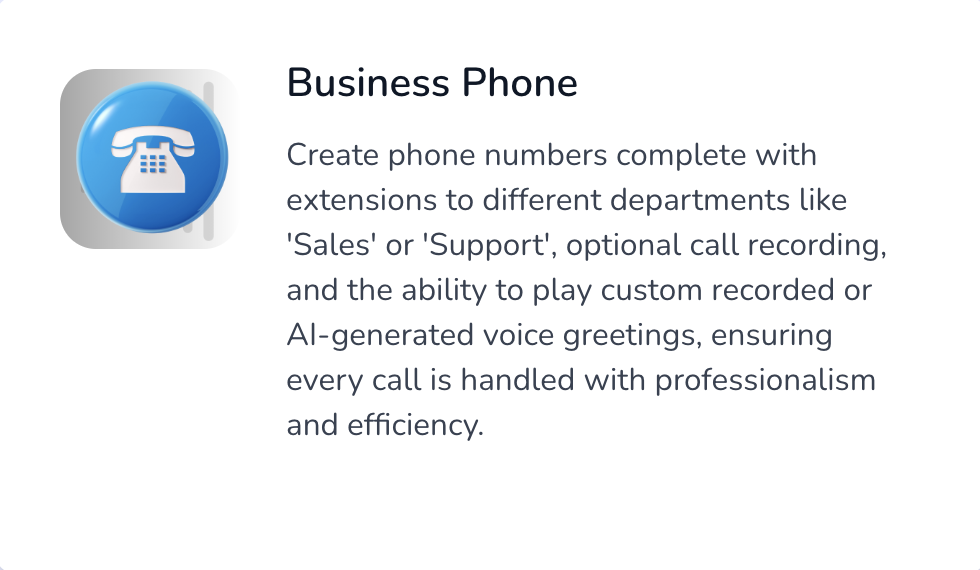 Business Phone: Create phone numbers complete with extensions to different departments like 'Sales' or 'Support', optional call recording, and the ability to play custom recorded or AI-generated voice greetings, ensuring every call is handled with professionalism and efficiency.