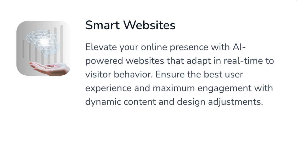 Smart Websites: Elevate your online presence with AI-powered websites that adapt in real-time to visitor behavior. Ensure the best user experience and maximum engagement with dynamic content and design adjustments.