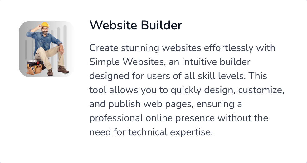 Website Builder: Create stunning websites effortlessly with Simple Websites, an intuitive builder designed for users of all skill levels. This tool allows you to quickly design, customize, and publish web pages, ensuring a professional online presence without the need for technical expertise.