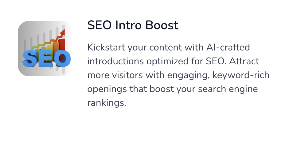 SEO Intro Boost: Kickstart your content with AI-crafted introductions optimized for SEO. Attract more visitors with engaging, keyword-rich openings that boost your search engine rankings.