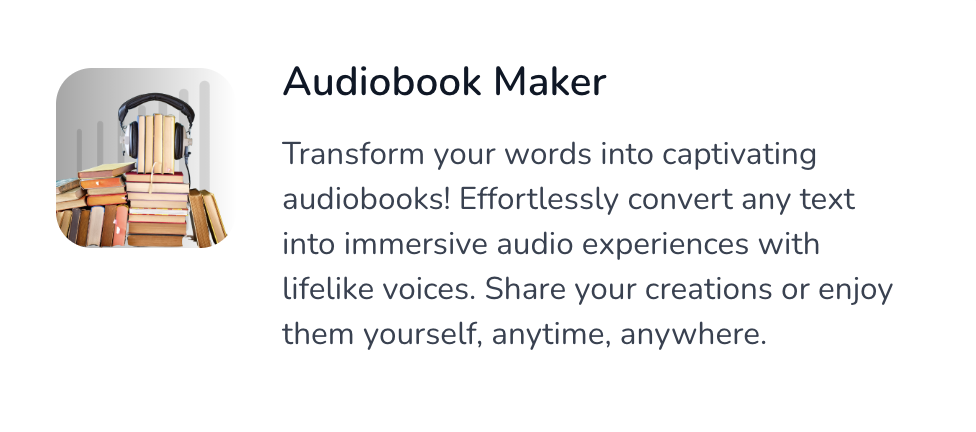 Audiobook Maker: Transform your words into captivating audiobooks! Effortlessly convert any text into immersive audio experiences with lifelike voices. Share your creations or enjoy them yourself, anytime, anywhere.