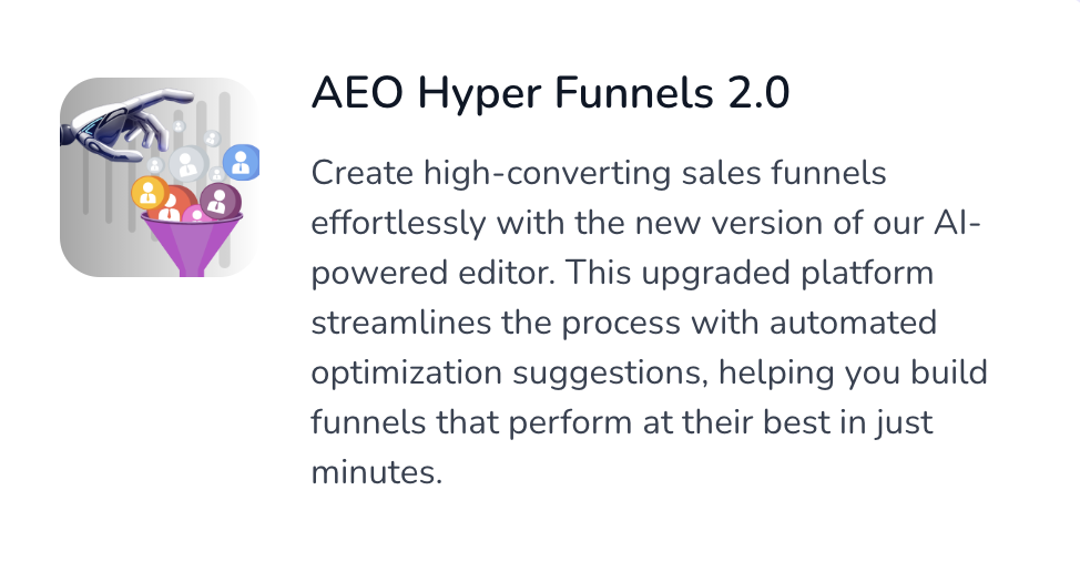 AEO Hyper Funnels 2.0: Create high-converting sales funnels effortlessly with the new version of our AI-powered editor. This upgraded platform streamlines the process with automated optimization suggestions, helping you build funnels that perform at their best in just minutes.