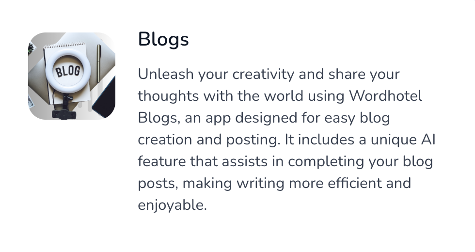 Blogs: Unleash your creativity and share your thoughts with the world using Wordhotel Blogs, an app designed for easy blog creation and posting. It includes a unique AI feature that assists in completing your blog posts, making writing more efficient and enjoyable.
