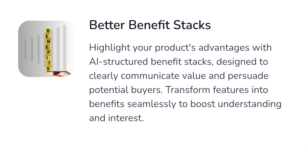 Better Benefit Stacks: Highlight your product's advantages with AI-structured benefit stacks, designed to clearly communicate value and persuade potential buyers. Transform features into benefits seamlessly to boost understanding and interest.