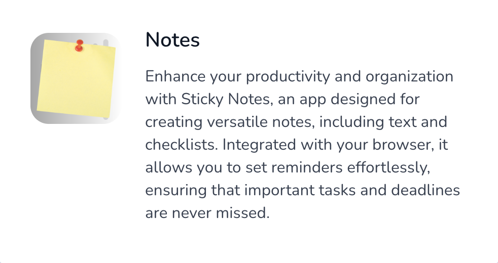 Notes: Enhance your productivity and organization with Sticky Notes, an app designed for creating versatile notes, including text and checklists. Integrated with your browser, it allows you to set reminders effortlessly, ensuring that important tasks and deadlines are never missed.
