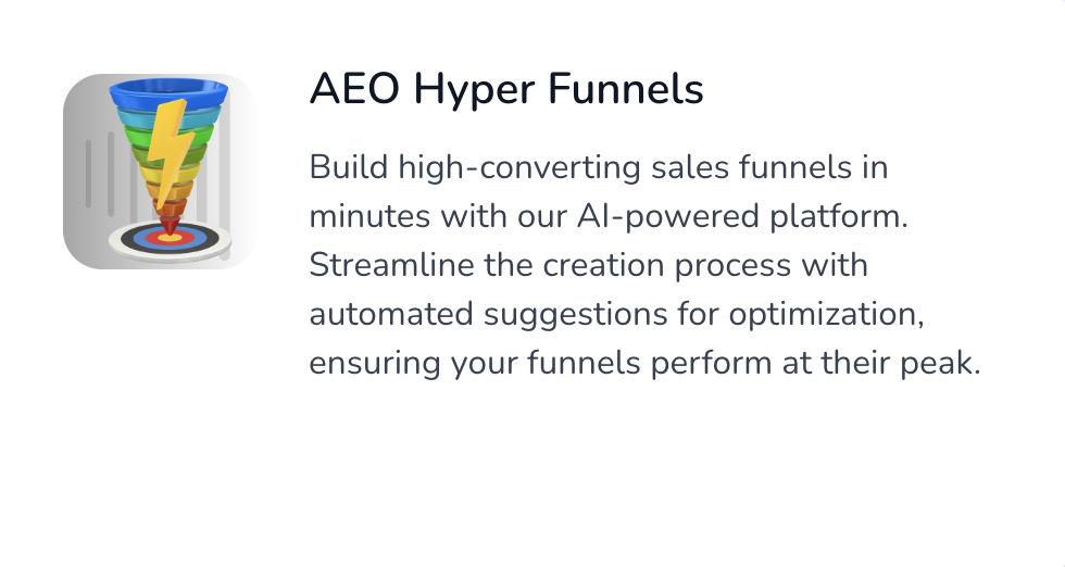 AEO Hyper Funnels: Build high-converting sales funnels in minutes with our AI-powered platform. Streamline the creation process with automated suggestions for optimization, ensuring your funnels perform at their peak.