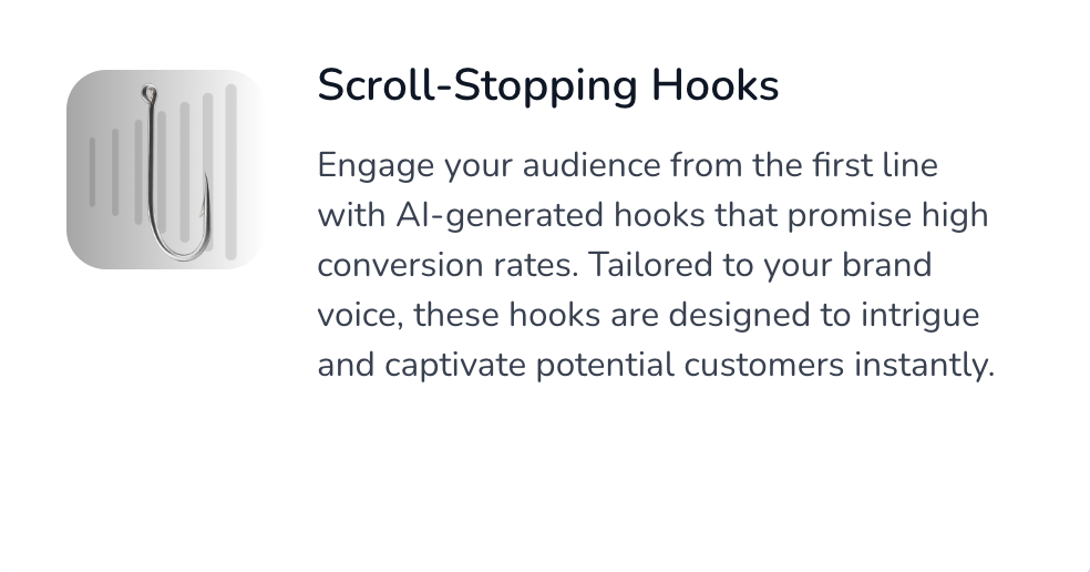 Scroll-Stopping Hooks: Engage your audience from the first line with AI-generated hooks that promise high conversion rates. Tailored to your brand voice, these hooks are designed to intrigue and captivate potential customers instantly.