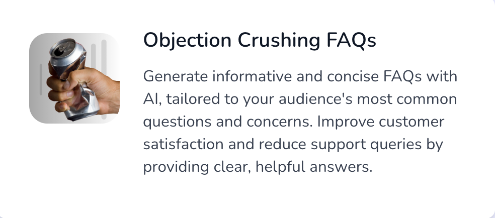 Objection Crushing FAQs: Generate informative and concise FAQs with AI, tailored to your audience's most common questions and concerns. Improve customer satisfaction and reduce support queries by providing clear, helpful answers.