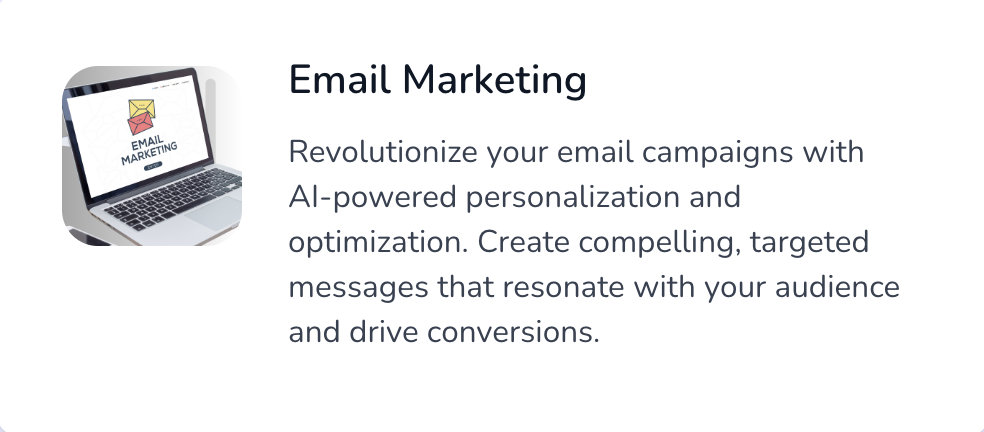 Email Marketing: Revolutionize your email campaigns with AI-powered personalization and optimization. Create compelling, targeted messages that resonate with your audience and drive conversions.