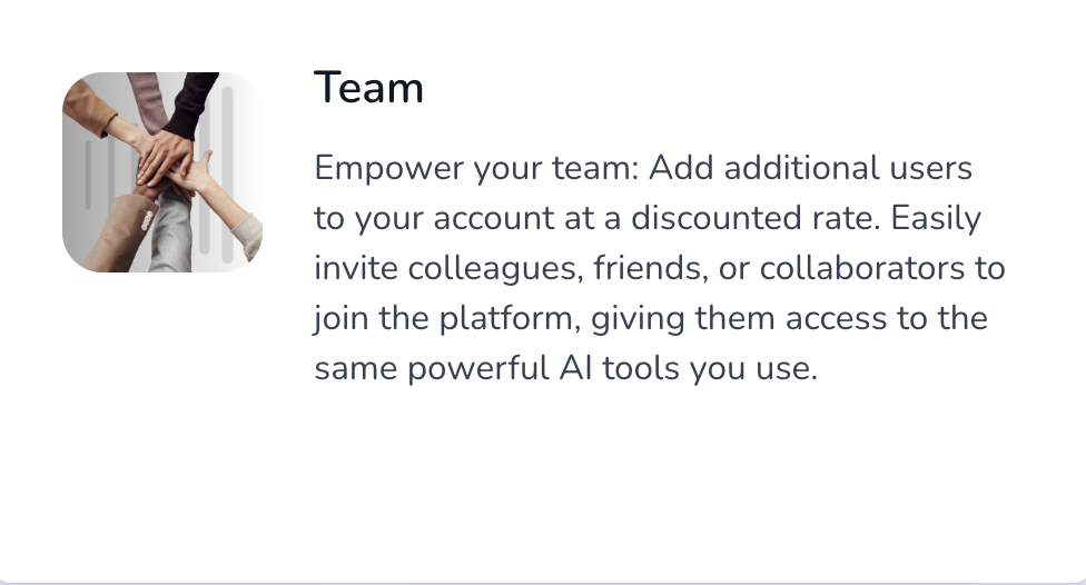Team: Empower your team: Add additional users to your account at a discounted rate. Easily invite colleagues, friends, or collaborators to join the platform, giving them access to the same powerful AI tools you use.