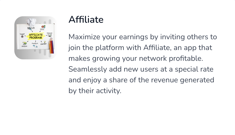Affiliate: Maximize your earnings by inviting others to join the platform with Affiliate, an app that makes growing your network profitable. Seamlessly add new users at a special rate and enjoy a share of the revenue generated by their activity.