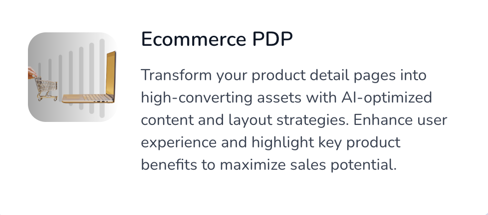 E-Commerce PDP: Transform your product detail pages into high-converting assets with AI-optimized content and layout strategies. Enhance user experience and highlight key product benefits to maximize sales potential.