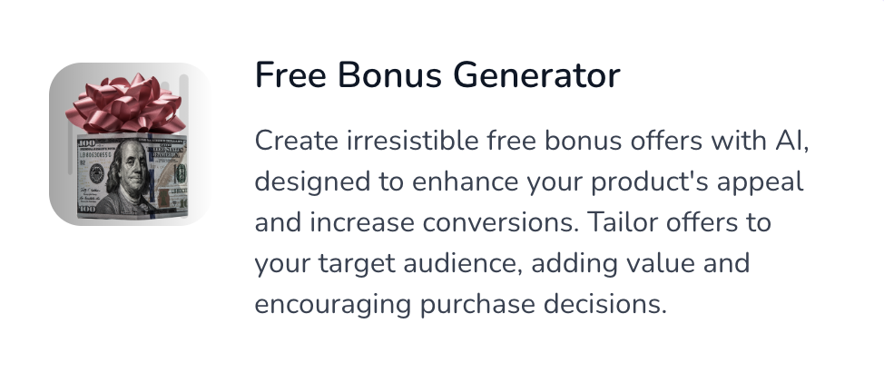 Free Bonus Generator: Create irresistible free bonus offers with AI, designed to enhance your product's appeal and increase conversions. Tailor offers to your target audience, adding value and encouraging purchase decisions.