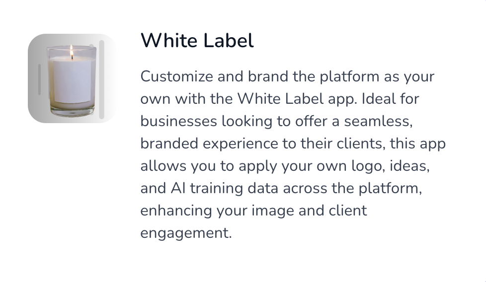 White Label: Customize and brand the platform as your own with the White Label app. Ideal for businesses looking to offer a seamless, branded experience to their clients, this app allows you to apply your own logo, ideas, and AI training data across the platform, enhancing your image and client engagement.*Option to purchase White Label Package for only $27/mo in the platform.