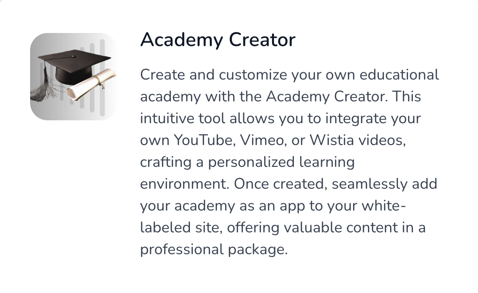 Academy Creator: Create and customize your own educational academy with the Academy Creator. This intuitive tool allows you to integrate your own YouTube, Vimeo, or Wistia videos, crafting a personalized learning environment. Once created, seamlessly add your academy as an app to your white-labeled site, offering valuable content in a professional package. Included in White Label Package.