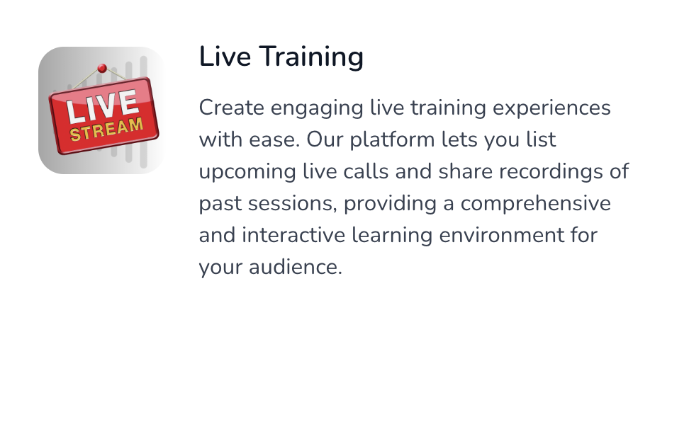 Live Training: Create engaging live training experiences with ease. Our platform lets you list upcoming live calls and share recordings of past sessions, providing a comprehensive and interactive learning environment for your audience. Included in White Label Package.