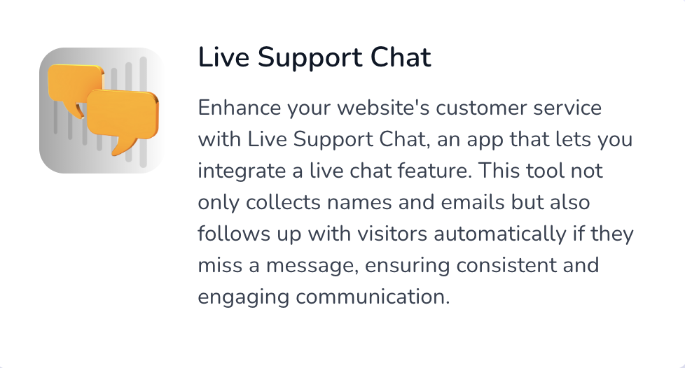 Live Support Chat: Enhance your website's customer service with Live Support Chat, an app that lets you integrate a live chat feature. This tool not only collects names and emails but also follows up with visitors automatically if they miss a message, ensuring consistent and engaging communication.