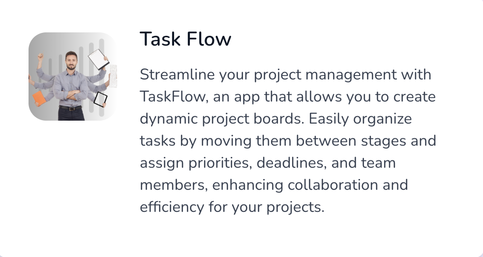 Task Flow: Streamline your project management with TaskFlow, an app that allows you to create dynamic project boards. Easily organize tasks by moving them between stages and assign priorities, deadlines, and team members, enhancing collaboration and efficiency for your projects.