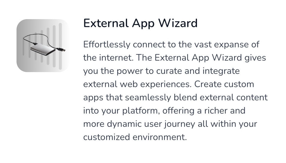 External App Wizard: Effortlessly connect to the vast expanse of the internet. The External App Wizard gives you the power to curate and integrate external web experiences. Create custom apps that seamlessly blend external content into your platform, offering a richer and more dynamic user journey all within your customized environment. Included in White Label Package.
