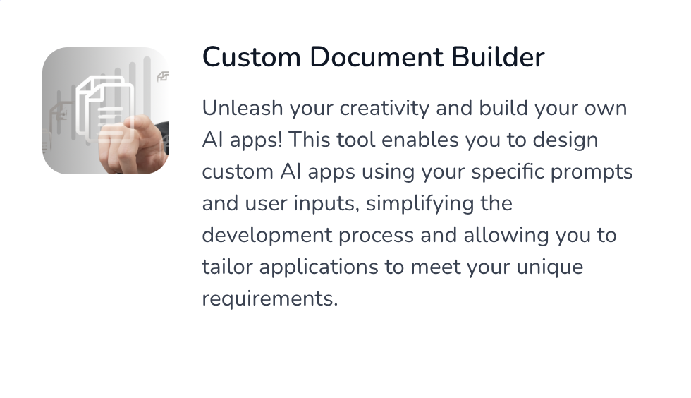 Custom Document Builder: Unleash your creativity and build your own AI apps! This tool enables you to design custom AI apps using your specific prompts and user inputs, simplifying the development process and allowing you to tailor applications to meet your unique requirements. Included in White Label Package.