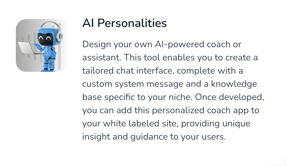 AI Personalities: Design your own AI-powered coach or assistant. This tool enables you to create a tailored chat interface, complete with a custom system message and a knowledge base specific to your niche. Once developed, you can add this personalized coach app to your white labeled site, providing unique insight and guidance to your users. Included in White Label Package.