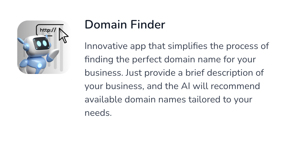 Domain Finder: Innovative app that simplifies the process of finding the perfect domain name for your business. Just provide a brief description of your business, and the AI will recommend available domain names tailored to your needs.