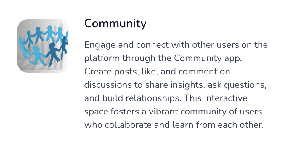 Community: Engage and connect with other users on the platform through the Community app. Create posts, like, and comment on discussions to share insights, ask questions, and build relationships. This interactive space fosters a vibrant community of users who collaborate and learn from each other.