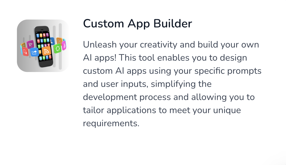 Custom App Builder: Unleash your creativity and build your own AI apps! This tool enables you to design custom AI apps using your specific prompts and user inputs, simplifying the development process and allowing you to tailor applications to meet your unique requirements. Included in White Label Package.